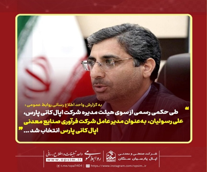 علی رسولیان به عنوان مدیرعامل جدید شرکت فرآوری صنایع معدنی اپال کانی پارس منصوب گردید و مسئولیت هدایت این مجموعه را از حسام مقدم‌ علی تحویل گرفت.