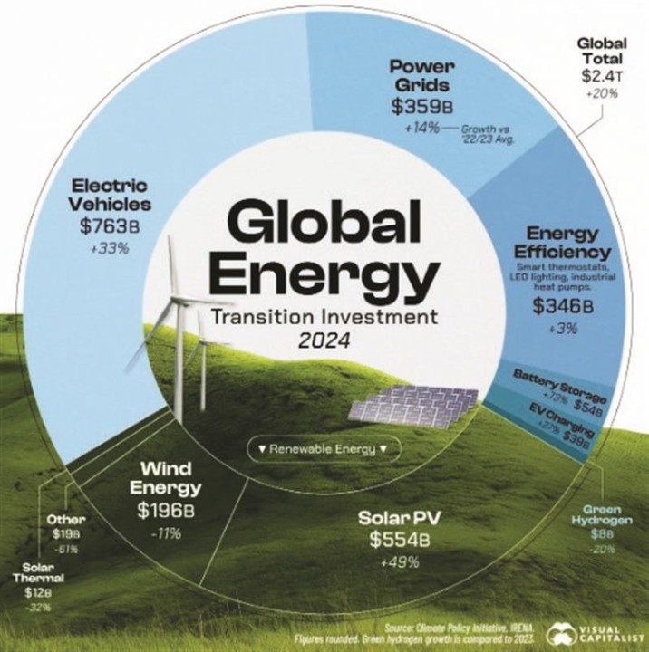 همانطور که در شکل 1 بهوضوح و با جزئیات ترسیم شده است، توزیع این سرمایه عظیم نشاندهنده اولویتهای استراتژیک قدرتهای اقتصادی است. برخلاف تصور رایج عمومی که شاید همچنان پنلهای خورشیدی یا توربینهای بادی را تنها نمادهای این گذار بداند، دادههای تحلیلشده در این نمودار حکایت از واقعیتی پیچیدهتر و البته صنعتیتر دارند. بخش اعظم این کیک 2.4 تریلیون دلاری، نه صرفاً در «تولید» برق، بلکه در لایههای «مصرف» و «توزیع» آن هزینه میشود. حملونقل الکتریکی و زیرساختهای شارژ وابسته به آن، با جذب رقمی بین 700 تا 800 میلیارد دلار، پیشتاز بلامنازع این مسابقه است و پس از آن، شبکههای برق قرار دارند که بهعنوان شریانهای حیاتی و نامرئی این سیستم جدید، صدها میلیارد دلار سرمایه را به خود اختصاص دادهاند.