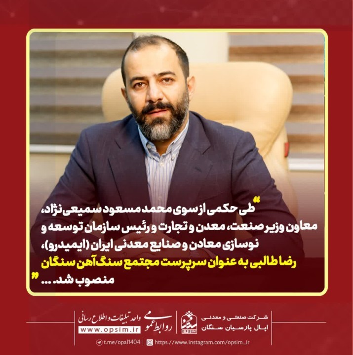 در حکم محمد مسعود سمیعینژاد آمده است: نظر به تعهد، شایستگی و تجارب ارزشمند، جناب آقای رضا طالبی به موجب این حکم به عنوان سرپرست مجتمع سنگآهن سنگان منصوب میشود.
